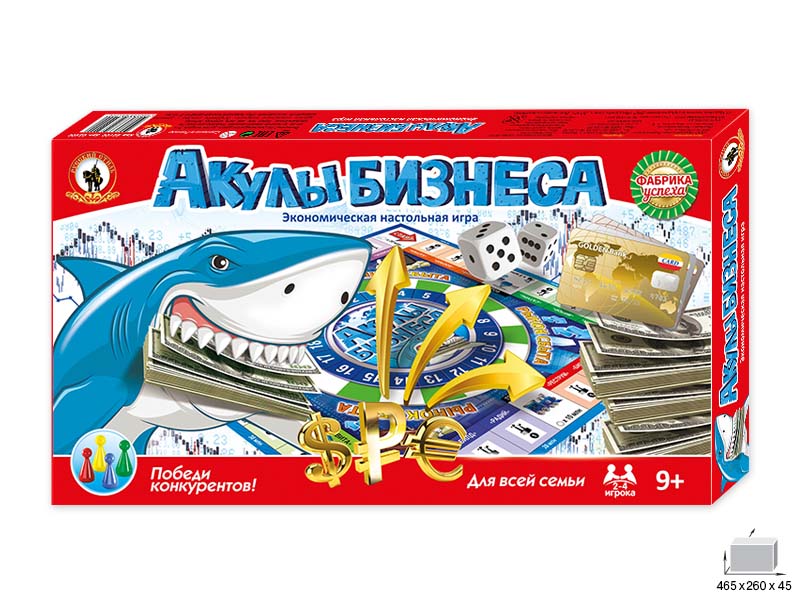 В этой увлекательной экономической игре игрокам предстоит стать главой производственной корпорации, открывать новые предприятия и завоевать рынок сбыта, беспощадно и решительно вытесняя с него всех конкурентов. Это игра для тех, кто рождён ПОБЕЖДАТЬ! Игроки смогут проявить свои лучшие деловые качества, научатся принимать верные управленческие решения, и станут хищниками финансового мира, проложив путь к успеху!¶Игра рассчитана на 2 – 4 игроков и предназначена для детей и взрослых.¶Состав игры:¶• игровое поле – 1 шт. • кубик – 2 шт. • фишки – 4 шт.¶• карточки предприятий – 24 шт. • символы предприятий – 48 шт.¶• карточки «кредит» – 4 шт. • карточка «инвестор» – 1 шт.¶• купюры – 6 листов • бланки чеков – 18 шт.¶• жетоны картонные – 81 шт. • правила игры¶