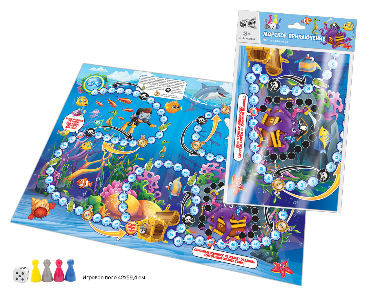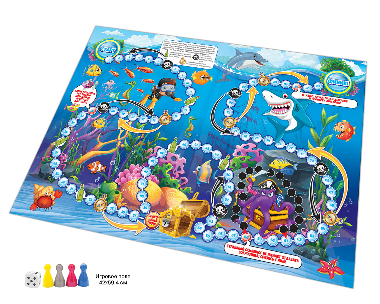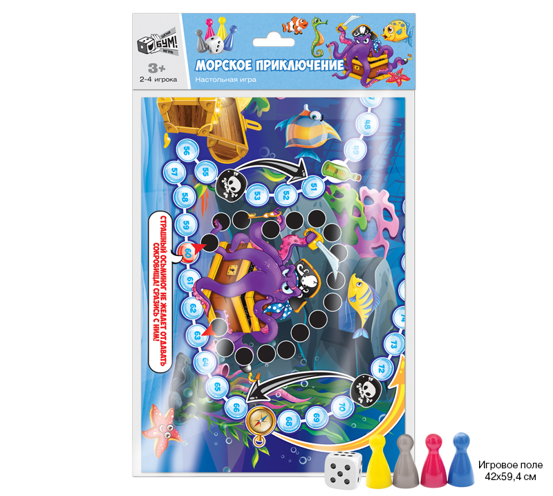 Увлекательная игра-ходилка в пакете с хеддером с 4-мя фишками необычных цветов (серебристый, малиновый, королевский синий, ярко-желтый). Увлекательная и понятная всем игра, которую легко взять с собой в поездку. Яркое большое игровое поле 594х420мм.