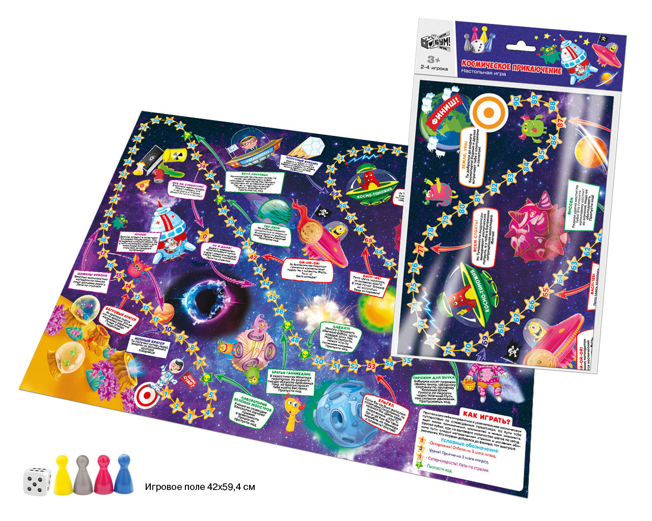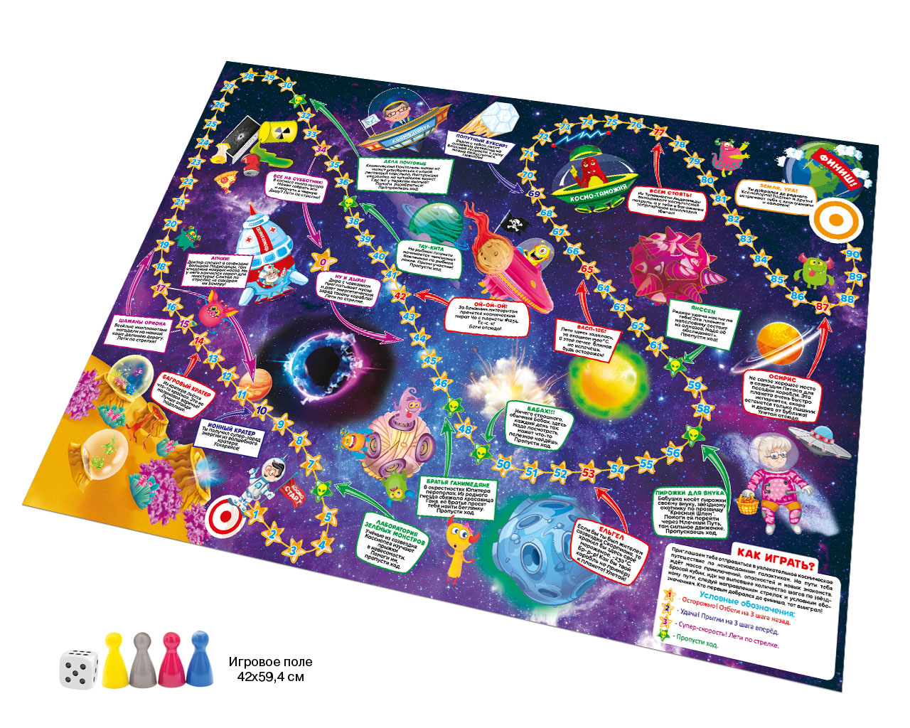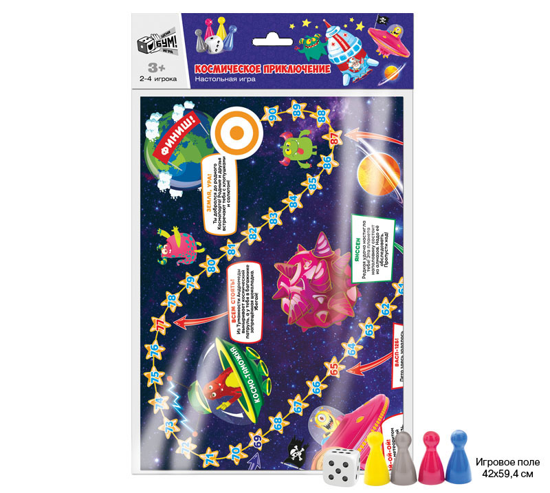 В наборе большое красочное поле размером 594/420 мм; кубик и 4 фишки необычных цветов: серебристая; малиновая; королевско-синяя и ярко-желтая.