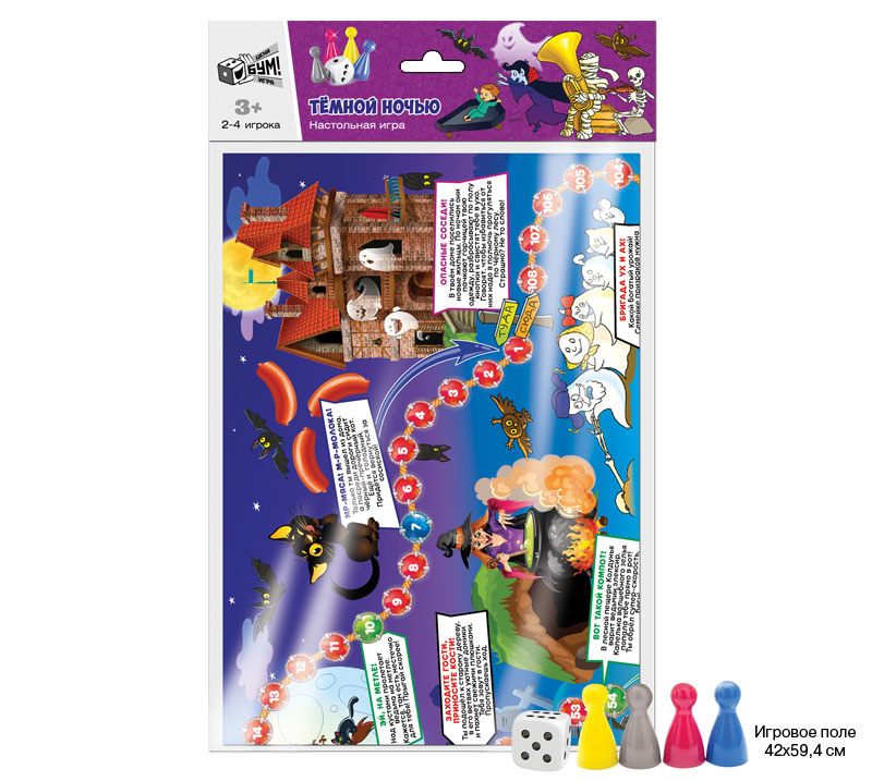 В наборе большое красочное поле размером 594/420 мм; кубик и 4 фишки необычных цветов: серебристая; малиновая; королевско-синяя и ярко-желтая.