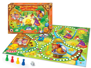 В наборе красочное игровое поле размером 420х594 мм; кубик и 4 фишки.