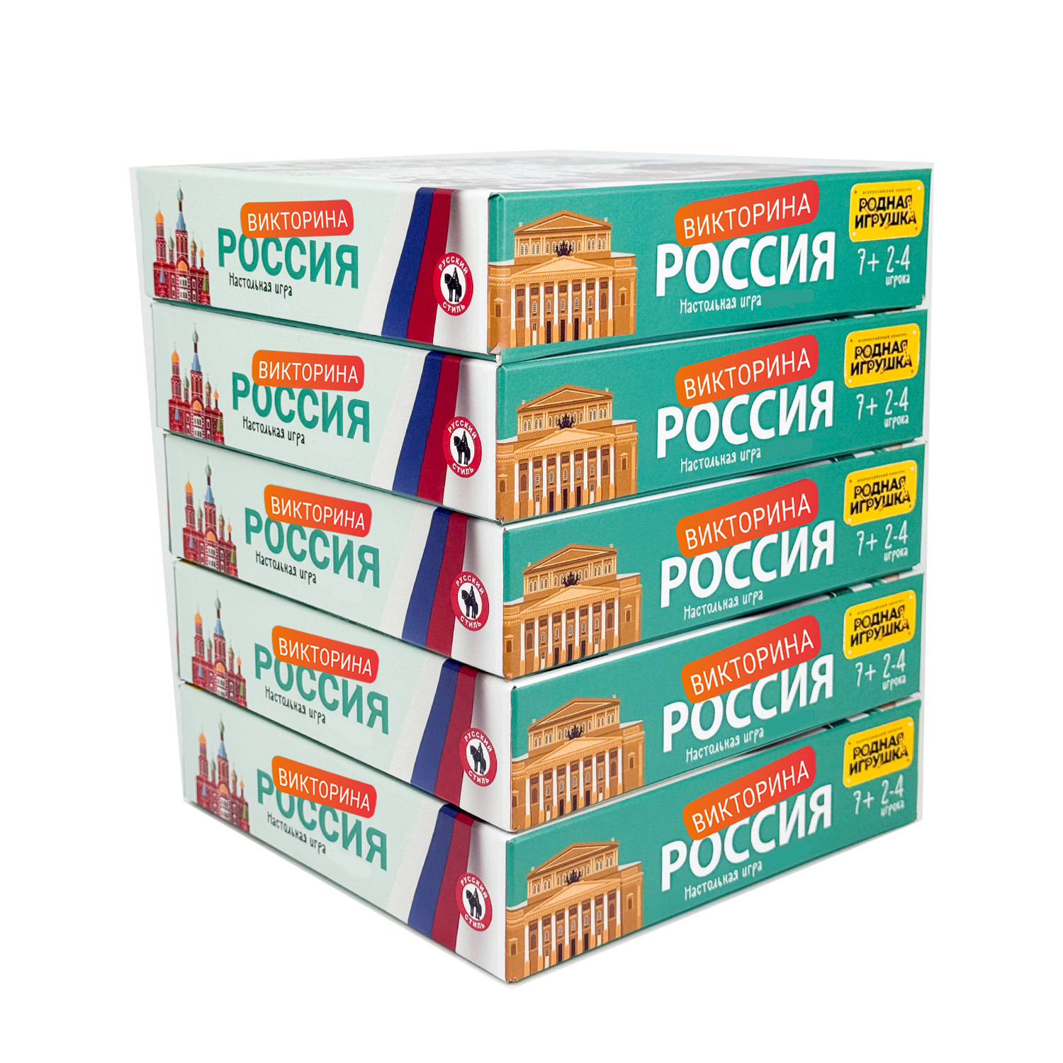 Победитель Всероссийского конкурса «Родная игрушка», 2025 г.. Настольная игра-викторина «Россия. Я люблю свою страну» - это увлекательное путешествие по России. Каждый участник игры станет путешественником, исследующим самые интересные уголки нашей страны. Дети откроют для себя её многообразие, культуру и природу! Каждого игрока ждет множество открытий, даже взрослые обязательно узнают что-то новое! На игровом поле изображена карта России и дорожка ходов, состоящая из клеток с заданиями-вопросами и больших клеток с городами. В процессе игры игроки отвечают на вопросы викторины, получают сувениры и карточки с городами. Выигрывает игрок, набравший максимальное количество сувениров. Игровой процесс выстроен так, что дети все время вовлечены в игру, вопросы викторины познавательные и интересные. А полученные жетоны-сувениры добавляют игрокам азарта. Количество игроков: 2-4. Возраст: 7+ Состав набора: игровое поле; карточки – 224 шт.; жетоны-72 шт.; фишки – 4 шт.; кубик; правила. Материал: картон; бумага; пластмасса.