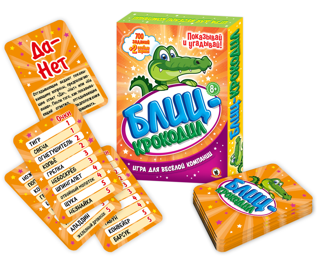 Эта увлекательная и весёлая игра разовьёт смекалку и актёрские способности игроков. Правила игры просты: участники по очереди становятся ведущими и с помощью жестов объясняют другим игрокам слова, написанные на карточках. На каждой карточке вы найдете 10 слов разной степени сложности. Помимо карточек с вопросами в комплекте две особые карты: «Такой-сякой», вытянув которую нужно описать загаданное слово с помощью определений, и «Да-Нет», вытянув которую команда задает ведущему вопросы, предполагающие ответ «Да!» или «Нет!». Выигрывает тот, кто угадал больше всего слов. Эта интересная игра сделает любую вечеринку незабываемой!¶Карточки – 72 шт., правила.
