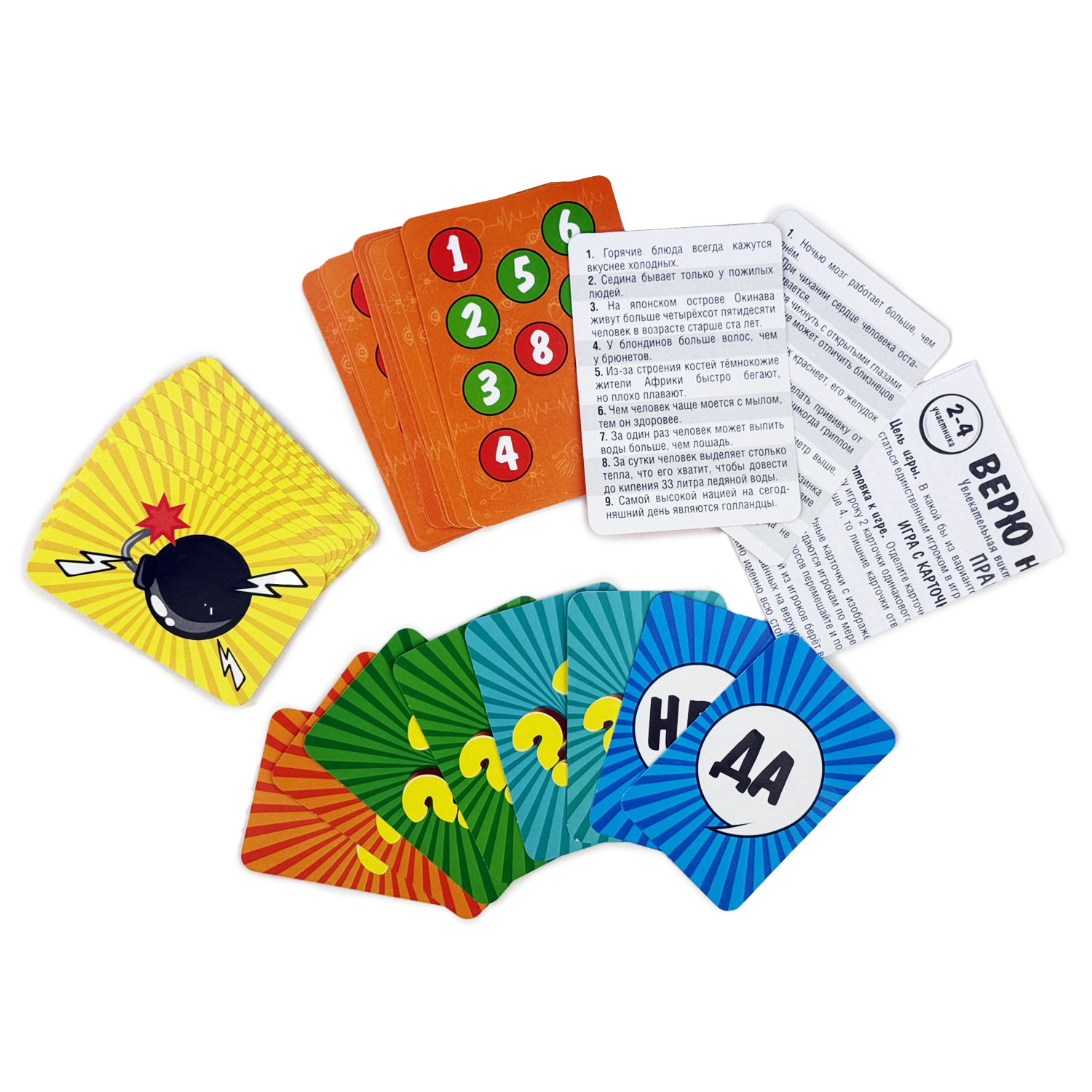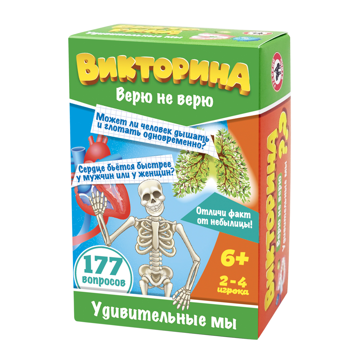 Увлекательная познавательная викторина для всей семьи поможет в игровой форме узнать много удивительных и малознакомых фактов о том, как устроен человек. Дети узнают ответы на такие интересные вопросы как: Может ли человек дышать и глотать одновременно? У кого чаще бьется сердце: у мужчин или у женщин? Поможет ли шоколад вылечить кашель? Можно ли чихнуть с открытыми глазами? и многое другое. В комплекте более 170 тематических вопросов: факты и небылицы. От игроков потребуется не только смекалка и эрудиция, но и умение отличать факт от небылицы. Игрок в свой ход задает понравившийся вопрос, все игроки делают ставки: "ДА" или "НЕТ". Тот, кто ошибся, получает штрафную карточку "Бомбочку". Кто набрал 4 штрафные карточки, выбывает из игры. Игроки могут использовать те вопросы, которые представлены на карточках, а также могут самостоятельно искать или придумывать вопросы. Игра-викторина будет интересна детям и взрослым, поможет познакомиться поближе с удивительными фактами о человеке. Игра отлично подойдет для веселой компании. Наборы этой серии совместимы между собой. Состав игры: карточки с вопросами – 18 шт., игровые карточки – 26 шт., правила.