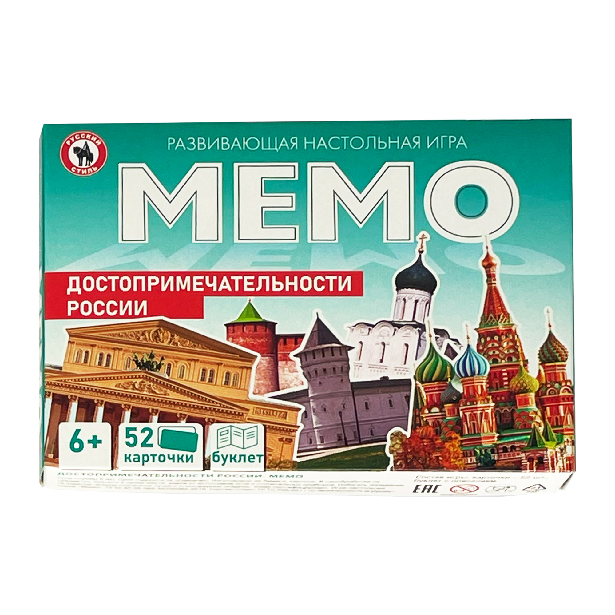 Мемо - увлекательная игра для развития памяти и внимания. Карточки выкладываются на столе рядами рубашкой вверх, в свой ход игрокам необходимо открыть две одинаковые карточки. Выигрывает тот, кто наберет больше всего парных карточек. Россия – страна с многовековой историей и богатой культурой, ее просторы поражают воображение. Восхитительные памятники архитектуры и уникальные достопримечательности раскинулись от Балтики до Тихого океана. Некоторые архитектурные и историко-культурные памятники на территории Российской Федерации внесены в список объектов Всемирного Наследия ЮНЕСКО. В этом наборе собраны фотографии самых известных и интересных достопримечательностей нашей страны. В наборе 52 карточки, буклет с описанием фотографий. Для 2-4 игроков. Возраст 6+. Материал: картон, бумага.