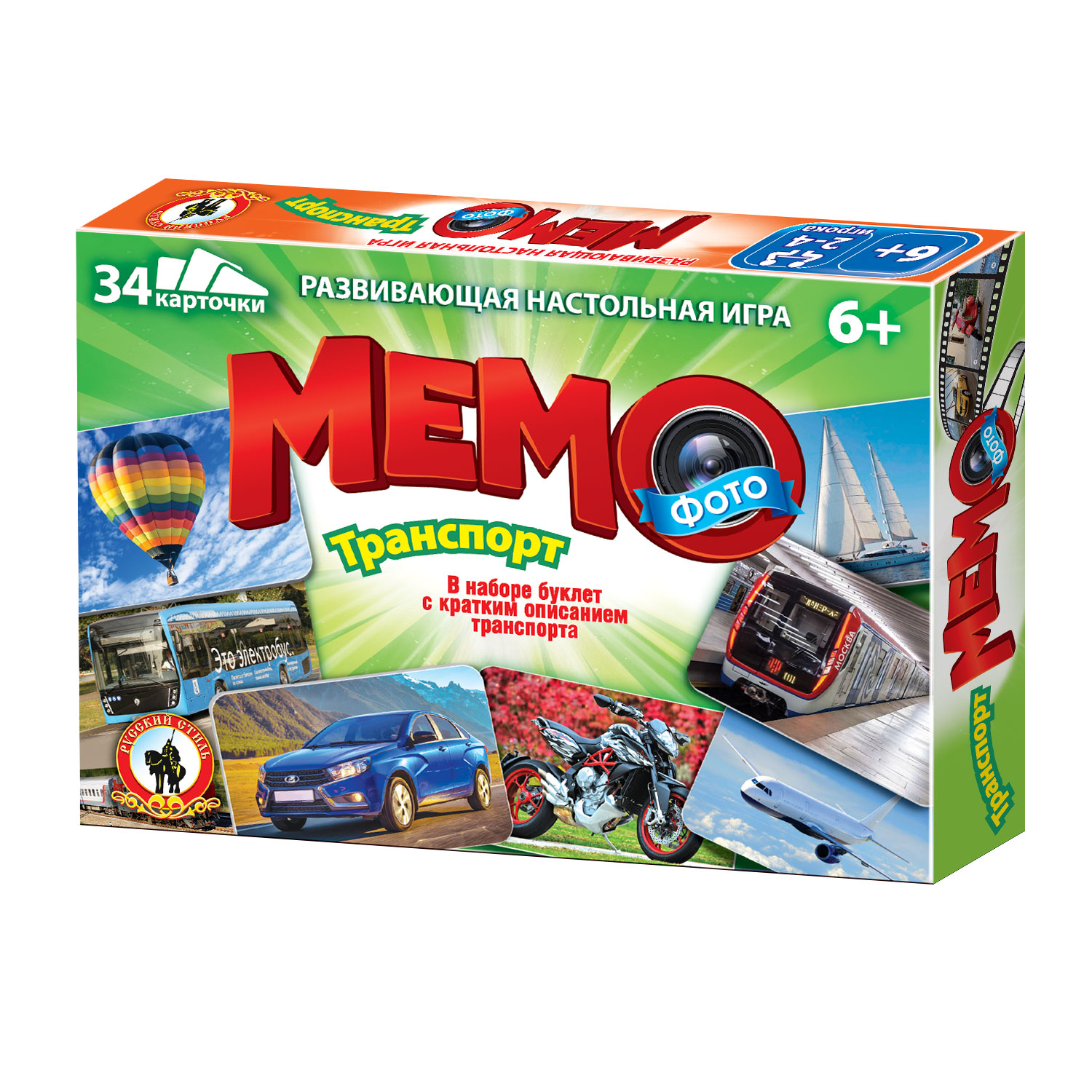 Мемо - увлекательная игра для развития памяти и внимания. Карточки выкладываются на столе рядами рубашкой вверх, в свой ход игрокам необходимо открыть две одинаковые карточки. Выигрывает тот, кто наберет больше всего парных карточек. Современный транспорт – одно из важнейших достижений человечества. В процессе игры дети познакомятся с различными видами транспорта: наземным, воздушным, водным, подземным, и узнают, чем они отличаются. Набор подойдет для обучения и игры с детьми дома и в группе. В наборе 34 карточки, буклет с описанием фотографий. Для 2-4 игроков. Возраст 6+. Материал: картон, бумага.