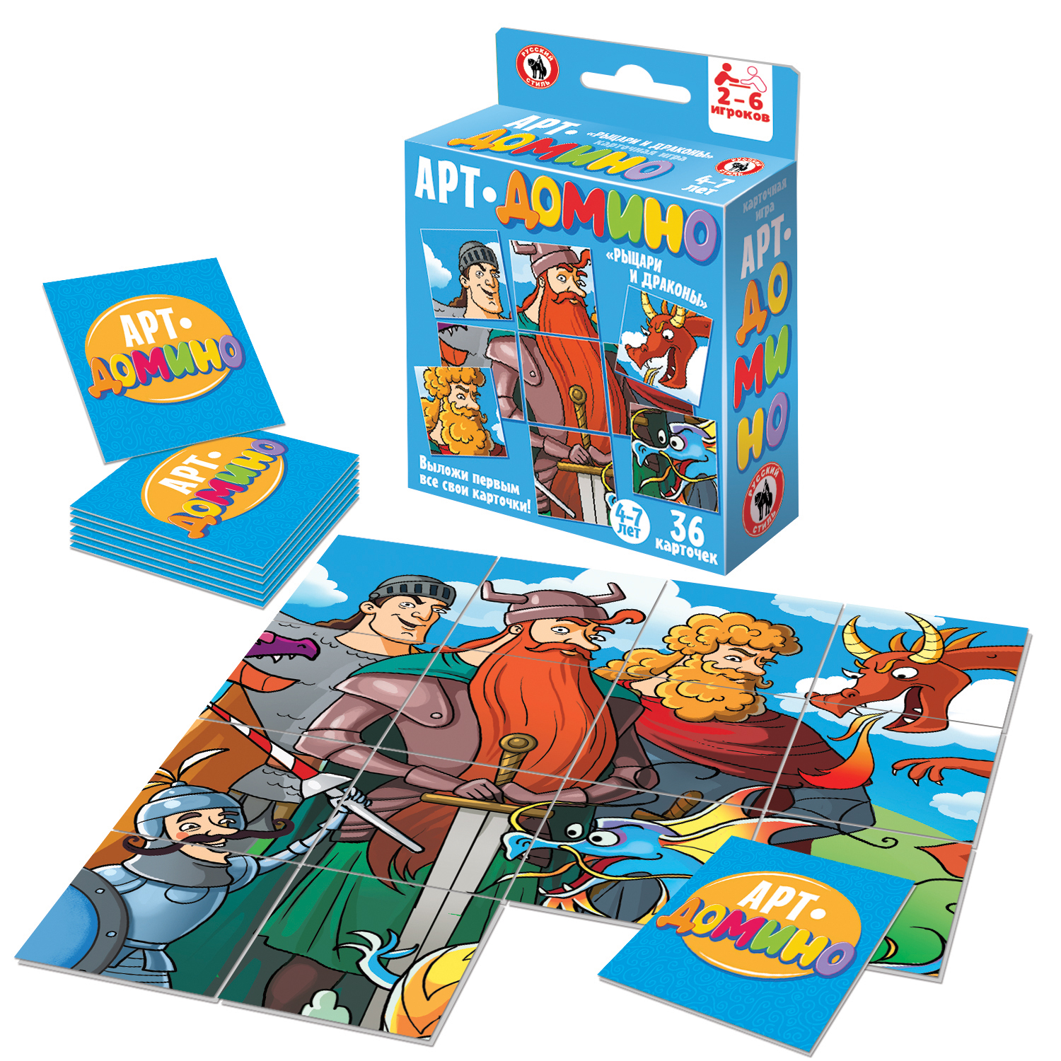 Арт-домино – увлекательная простая игра. Задача игроков – собрать красивую картинку с изображением рыцарей и драконов. Игрокам раздаются карточки по 6 штук каждому, далее игроки по очереди выкладывают на стол карточки так, чтобы собралось изображение. Если нужной части картинки у игрока нет, он берет дополнительную карточку. Выигрывает тот, кто первым выложит все свои карточки. Игра отлично развивает образное мышление, фантазию, учит составлять изображение из частей и выделять объекты. Игра станет отличным развлечением для компании детей до 6 человек. Количество игроков: 2-6 Возраст: 4-7 лет Состав игры: карточки – 36 шт., правила Материал: картон, бумага