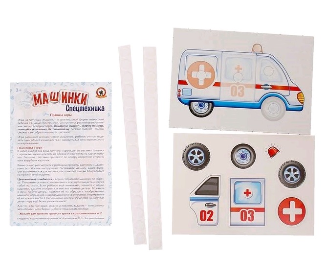 Игра на липучках «Машинки» в оригинальной форме познакомит ребёнка с видами спецтехники. Он научится распознавать основные виды спецтранспорта: пожарную машину, скорую помощь, полицейскую машину, бетономешалку. А самое главное – малыш сможет сам собрать машину из деталей! Детали крепятся к основе на липучках, собирать машинки легко и интересно! Игра предназначена для детей от 3 до 8 лет и их родителей. Игра развивает ассоциативное мышление, ребёнок учится выделять один объект из множества и находить для него верное место на карте-основе. Состав игры: • Машинки-основы – 4 шт. • Карточки-детали – 16 шт. • Липучки – 32 шт. • Правила игры