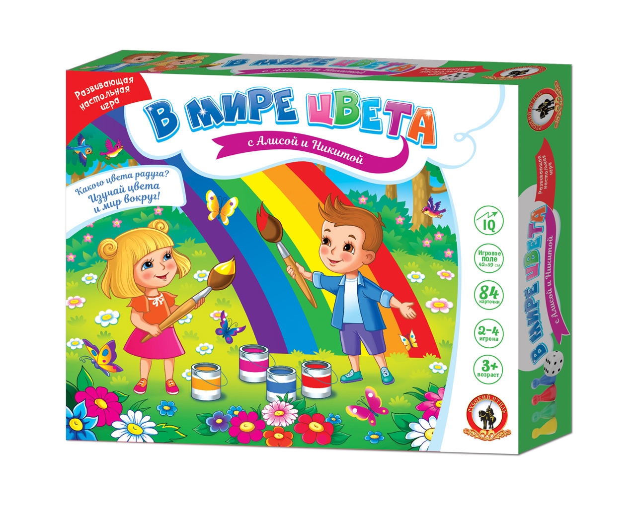 Весёлые друзья Алиса и Никита приглашают отправиться в увлекательное путешествие в мир цвета! Играя в эту развивающую игру, малыши познакомятся с цветами радуги, узнают, какого цвета бывают предметы и животные вокруг нас, научатся объединять их в группы по цветовому признаку. В комплекте: игровое поле – 1 шт., карточки – 84 шт., фишки – 4 шт., кубик – 1 шт., правила игры.