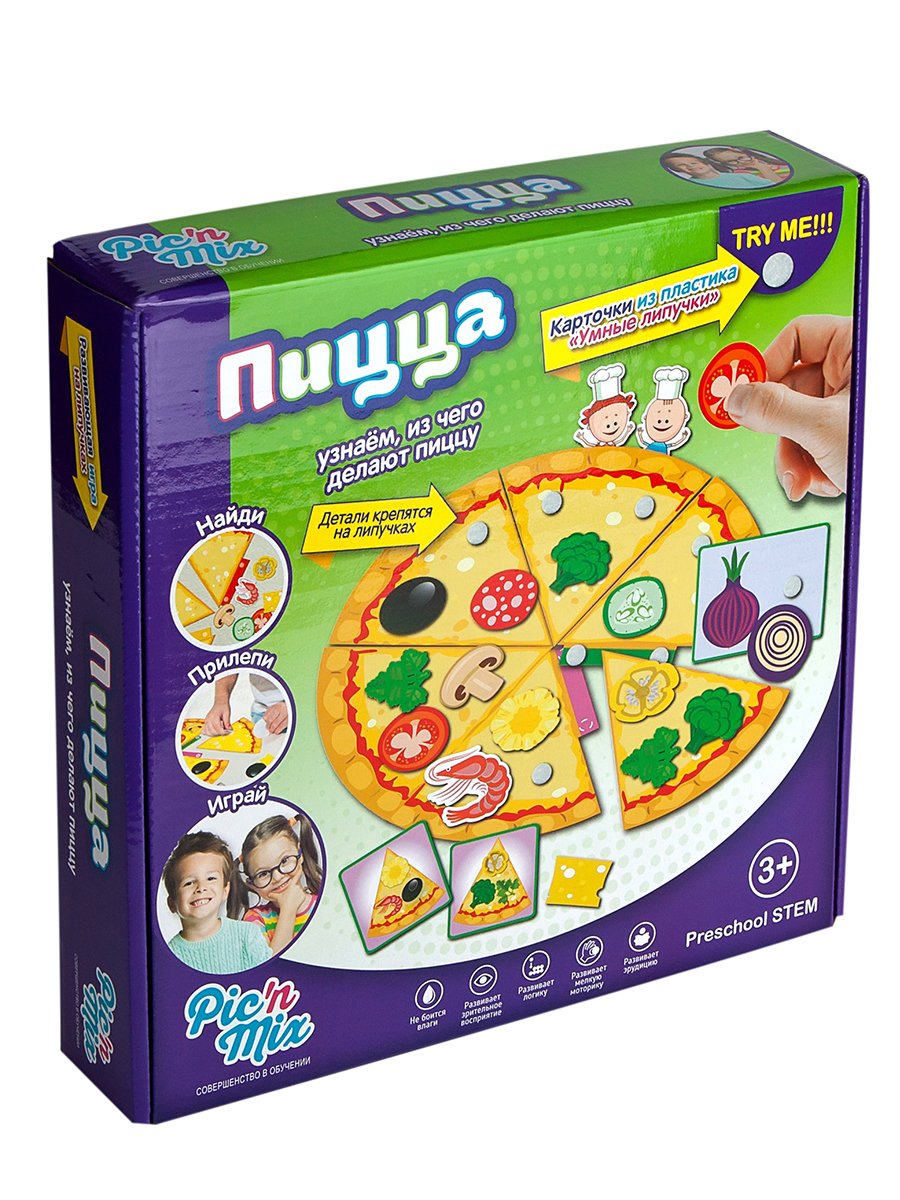 Обучающая игра -пазл липучка состоит из 6 игровых полей; в виде кусков пиццы. Прикрепляя на поля различные инредиенты; игрок запоминает не только внешний вид; но также и названия различных продуктов; которые используются для приготовления Пиццы. В процессе игры ребенок тренирует логику; память; расширяет свой словарны запас и кругозор.