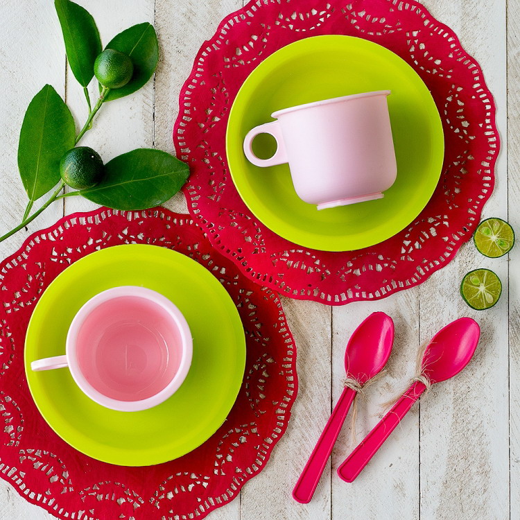 Изящная чайная пара «Лайм» станет лучшим подарком для ценителей чайной церемонии! Насыщенный лимонный цвет блюдечек, чашечки нежно-розового окраса и две аккуратные ложечки любимого «девчачьего» цвета — такой набор займет достойное место на праздничном столе маленькой хозяйки. Учимся сервировать стол, расставляем угощение и пора пригласить на чаепитие лучшую подругу — маму.