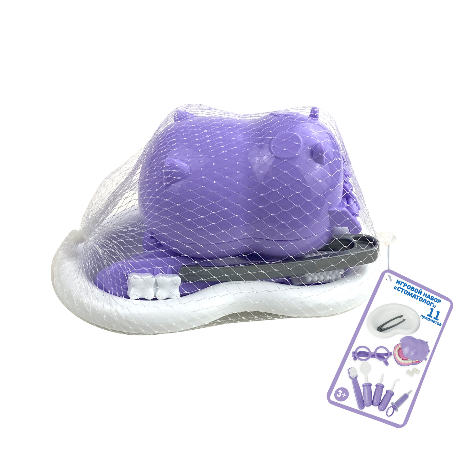 Игровой набор «Стоматолог» 11 предметов, в сетке. Состав набора: бегемот, очки, шприц, пинцет, щетка, сверло, крючок, ванночка, зубки 2 шт., зеркальце. Набор отлично подойдет для мальчиков и девочек, развивает фантазию, обучает. Изготовлен из пластика.
