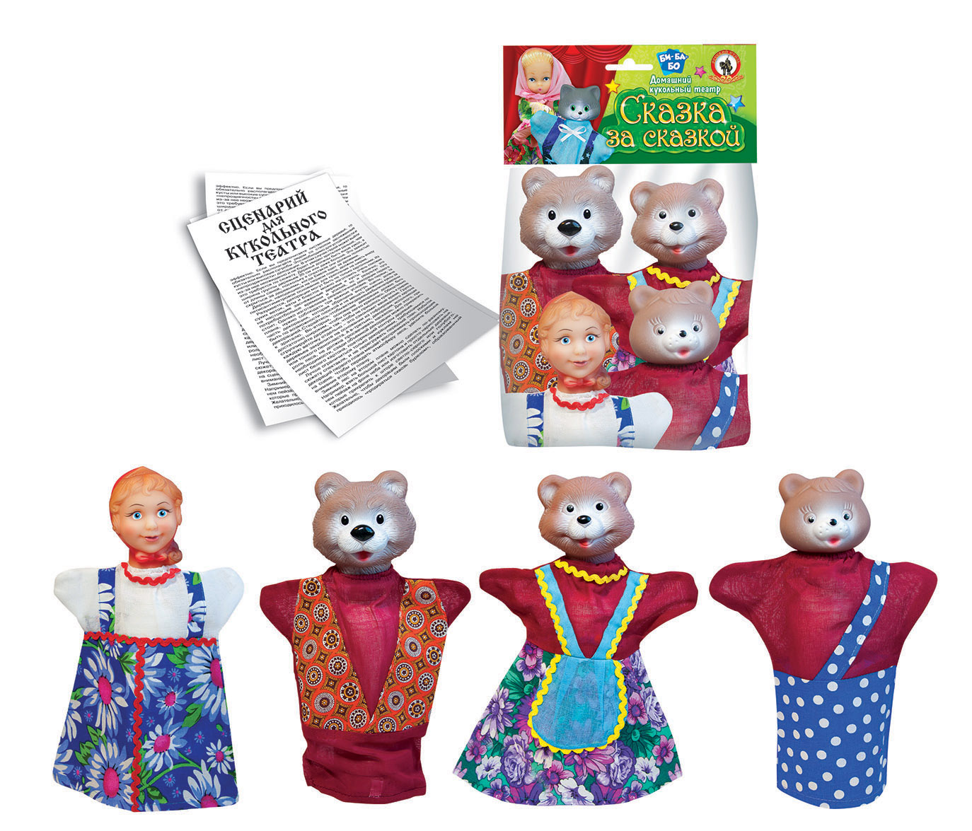 Игра для детей от 3 лет. Состав набора: • Куклы-перчатки – 4 шт. (внучка, мишутка, медведь, медведица) • Сценарий сказки